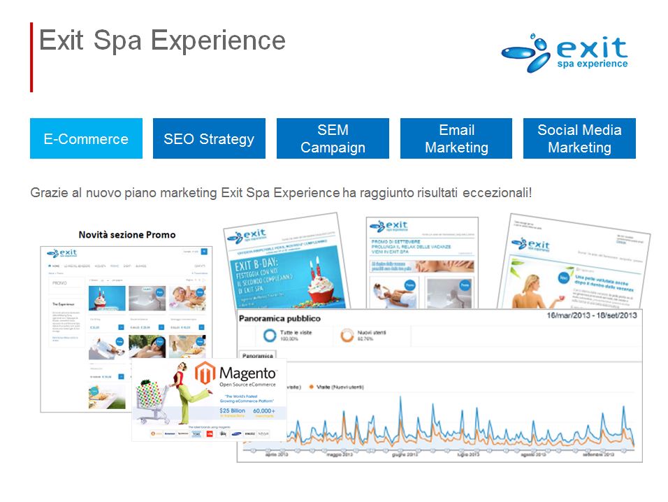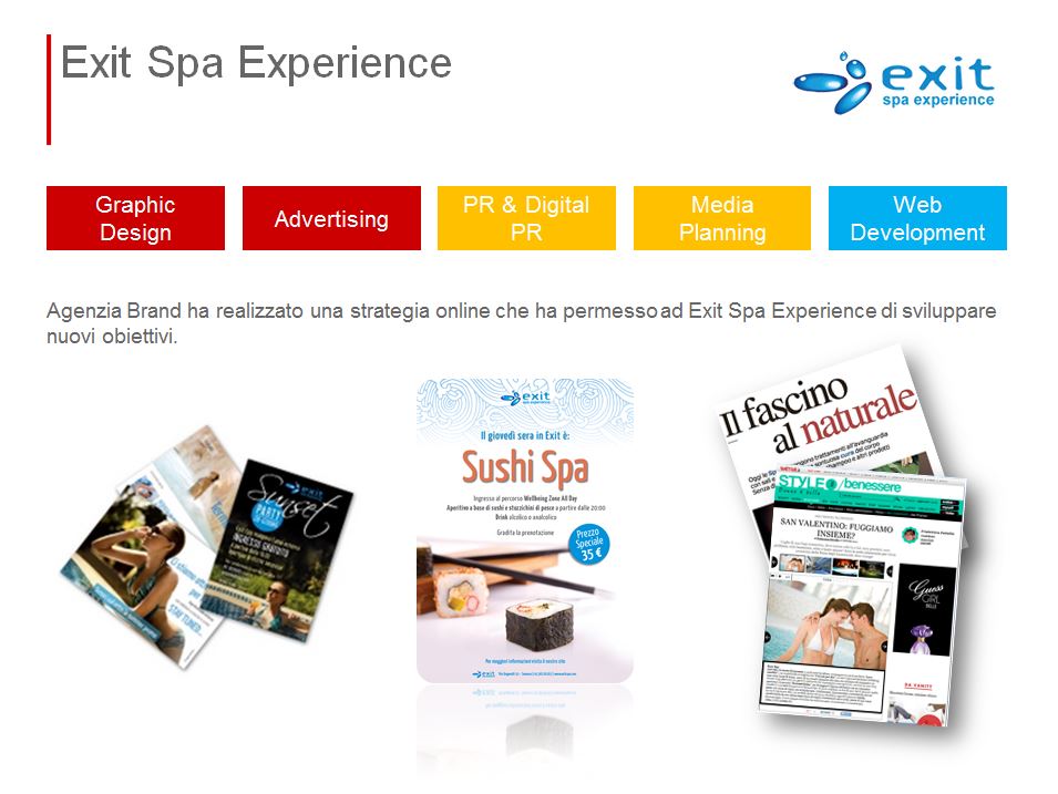 Agenzia Brand ha realizzato una strategia online che ha permesso ad Exit Spa Experience di sviluppare nuovi obiettivi. Grazie al nuovo piano marketing Exit Spa Experience ha raggiunto risultati eccezionali!